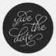 Elegant and simple save the date stickers are perfect for sealing your save the date envelopes. Black and white design features "save the date" in embellished white script typography with a subtle heart worked into the design.