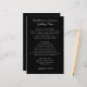Affordable wedding menu in neutral black and white. Black paper with white text templates have the names of the couple with menu title at the top. All menu items are added in a single paragraph. Add spaces as preferred to even out text. Date of event is at the bottom of the paper.
