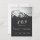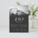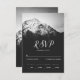 Black and white wedding under the mountains. Landscape photograph of a snow covered mountain with darkness below and white cloudy sky above. Names of the couple are in black font above the mountain in the sky and all the details are in white font below the mountain. Completely customisable and personalizable wedding products.