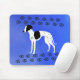 Black and white Whippet dog image with paw prints on a blue sky background.