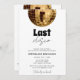 This Black and White with Gold Last Disco Bachelorette Weekend invitation exudes a striking minimalism that is effortlessly chic. The classic contrast of black and white sets the stage for a timeless aesthetic, while the shimmering presence of a gold disco ball at the top infuses the design with a touch of glamour and excitement. The combination of these elements creates an invitation that is both sophisticated and playful, perfectly capturing the essence of a memorable bachelorette celebration infused with the spirit of disco.