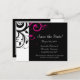 Bold and striking modern contemporary black wedding invitation set with white and magenta accents, with delicate swirl scroll leaf background. Customise online with your wedding details.