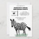 A realistic style illustration of a zebra standing in some green grass illustrates this custom birthday party invitation that's suitable for parties for kids and adults alike.