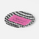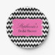 Personalised black and white zigzag chevron pattern and hot pink background. Bridal Shower paper plates. In the middle there is a hot pink shape where you can add your text.