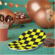 Paper plate with a black and yellow chequered pattern. Perfect for a race themed gathering.