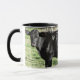 A softened colour photograph of two young Black Angus heifers on a rural country farm field. One has a splash of white on her belly, and both are dappled in sunlight.