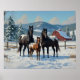 A beautiful black appaloosa horse family in the snow in a pasture on a farm. A scenic winter landscape behind them includes a red barn, trees, and hills.