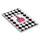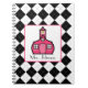 A spiral notebook featuring a black argyle design. Pink Schoolhouse inside square at centre. Personalise with your name.