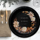 Black Autumn Wedding Paper Plates. These elegant wedding paper napkins feature hand-painted watercolor burnt orange and terracotta leaves, cream and beige dahlias, and beautiful rust-coloured roses on a black background with the bride and groom's first name and wedding date. Find matching items in the Black Autumn Romance Collection.