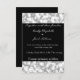 A wedding invitation featuring is a black background with faux glamours silver inspired design with silver text.
