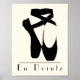 An illustration of a pair of black ballet shoes / slippers standing in the classical and contemporary ballet dancers pose up on the tips of their toes, known as en pointe. Background is a delicate eggshell white.