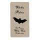 An eerie black bat on a burlap background, decorates this personalised wine, beer or drink label for Halloween.