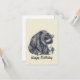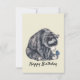 Adorable sitting black bear with butterfly illustration with Happy Birthday text, on cream background