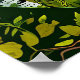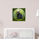 Black bear sitting in a lush green forest surrounded by birch trees, framed by decorative foliage.