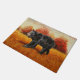 A cute black Bear taking a stroll through a field of bright fall coloured foliage.