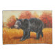 A cute black Bear taking a stroll through a field of bright fall coloured foliage.