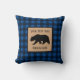 n the centre of the pillow is a silhouette of a black bear with text templates above and below in black lettering so you can personalise. this image and text is inside a burlap square with a black border. The background pattern is a lumberjack blue and black buffalo plaid.