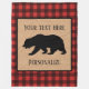 In the centre is a silhouette of a black bear with text templates above and below in black lettering so you can personalise. this image and text is inside a burlap square with a black border. The background pattern is a lumberjack red and black buffalo plaid.