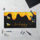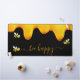 A chic black background decorated with golden dripping honey. The text: Bee Happy with a golden hand lettered style script with swashes.