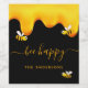 A chic black background decorated with golden dripping honey. The text: Bee Happy with a golden hand lettered style script with swashes. Personalise and add your name, family name. For summer parties, weddings, backyard BBQ's.
