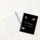 Decorated with happy, smiling yellow and black bumblebees. A chic black background. White hand lettered script and the text: Bee Happy. Personalise and add your name or a book title. A college ruled notebook, perfect for your notes and ideas working from home.