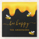 A chic black background decorated with golden dripping honey. The text: Bee Happy with a golden hand lettered style script with swashes. Personalise and add your name, family name.