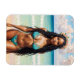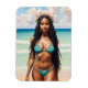 This magnet features oil painting style artwork of a beautiful black girl with long hair in twists or locs, wearing a teal bikini and flower crown of peach flowers. She is on the beach with the ocean behind her. Sexy summer-core coastal aesthetic.