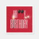 White Happy Birthday text on red background with confetti, candle, black balloons, and sparklers for birthday party.