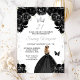 This elegant and glamourous birthday party invitation features a beautiful princess with blonde hair in a black ball gown. The text combines handwritten script and modern sans serif fonts for a classy and sophisticated look. The floral arrangements, butterfly and silver confetti create the perfect blend of rustic and chic.
