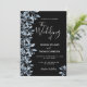 A trendy wedding invitation in white and silver blue. A chic black background on the front. Decorated with botanical silver blue coloured sprigs and foliage. Modern large handlettered script, typography with the text: The wedding of. Templates for names and wedding details. White text.