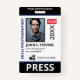 Vertical press ID with black and blue as accent colours. Add photo, logo, name, title, ID number and more.