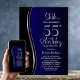 Invite your friends and loved ones with this modern black and blue surprise 55th birthday party invitation. The customisable text area in this invitation template allows you to effortlessly include all the necessary details for your special birthday celebration, including the date, time, venue, and RSVP information. A variety of paper types and corner styles are available for your unique invitations, along with the option to download if you prefer a digital format.