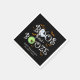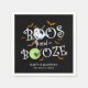 Boos & Booze Halloween adult party paper napkins features a black background, bats flying, an iridescent blue ghost flying through "boos", a cup of sizzling green booze with a red eyeball and straw.