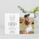 This chic graduation party photo invitation features a monogram surrounded by a botanical crest and a bow in black. The reverse side features a black background with geometric patterns. Personalise it for your needs. You can find matching products at my store.