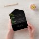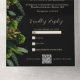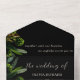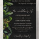 Dark moody all in one wedding design, featuring a deep emerald green woodland greenery border on a black background. With the added feature of a personalised QR Code that can be linked to your wedding website URL. Click the personalise button and add your website URL to the area provided and a brand new unique QR code will be generated on the design, that will direct your guests to your wedding website to RSVP online.