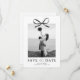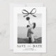 These wedding save the date cards feature a modern white background, with a photo centrepiece, and a classic black watercolor bow. On the back is another photo and further details about your future wedding.