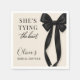Party napkins designed with a classic black bow motif and the phrase shes tying the knot. Created for a clean, elegant table setting that pairs well with black and white wedding decor. Suitable for bridal showers, engagement parties, bachelorette gatherings, and wedding celebrations. Fully customizable text with a print-ready design for cocktail or luncheon napkins.