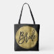 Bride all-over-print tote bags for wedding, bachelorette party or bridal shower with gold foil effect (faux, printed as an image) text printed on black background. Tote bag is made of polyester and measures 16 inches by 16 inches and the strap measures 28 inches.