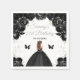 This elegant and glamourous birthday party napkin features a beautiful princess with brown hair in a black ball gown. The text combines handwritten script and modern sans serif fonts for a classy and sophisticated look. The floral arrangements, butterfly and silver confetti create the perfect blend of rustic and chic.