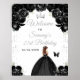 This elegant and glamourous birthday party welcome sign features a beautiful princess with brown hair in a black ball gown. The text combines handwritten script and modern sans serif fonts for a classy and sophisticated look. The floral arrangements, butterfly and gold confetti create the perfect blend of rustic and chic.