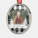 Rustic farm fresh Christmas trees family photo keepsake ornament. The ornament can be customised with the family name, the year, and the photo. Black chequerboard plaid background with rustic pine trees and snowflakes. The family name is displayed in a white banner. Artwork by Moodthology Papery.