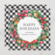Custom black and white buffalo plaid business holiday card featuring a watercolor wreath of branches, cones and ribbons. Easily personalize this plaid business holiday card with your company name.