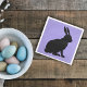 This paper napkin has a sitting black bunny in silhouette form with tall ears on a purple background.