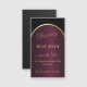 A magnetic Save the Date card for a 70th birthday party. A black and burgundy background, decorated with a faux gold arch. Personalise and add a date and your name. The text: Seventy and Save the Date is written with a large trendy hand lettered style script.