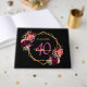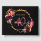 A Guest Book for a 40th birthday party. A chic black background with a faux gold geometric frame. Decorated with dark purple and burgundy flowers, roses and boho style feathers. Templates for a name, age 40 and a date. Date of birth or the date of the party. The name is written with a hand lettered style script, pink coloured letters, age in purple and the date with golden numbers. Text on the spine.