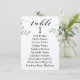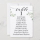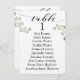 Swashed font black calligraphy writing against crisp white paper with green eucalyptus sprigs table chart cards with seating names for ten people.