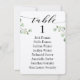 Swashed font black calligraphy writing against crisp white paper with green eucalyptus sprigs for eight guests table chart cards.