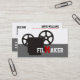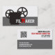 Film maker/director/Movie maker business cards, featuring a black vitage 35 mm movie style camera and the word “FILMAKER” with the M in red in the middle, on white and grey background. The back includes a QR code for more info.