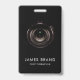 A modern ID badge for photographers showing your name and job title as well as a camera lens on black background. Ideal for photographers who would like to identify as such while working events.