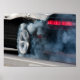 Black car performing burnout, spinning wheels causing the tires smoke. Photography.